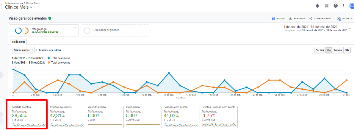 Aqui, podemos verificar os eventos realizados no site por meio do Google Ads no mês de dezembro, em comparação com novembro. Houve um aumento de 38,55% nos contatos com a empresa. Esses eventos rastreáveis foram feitos através do ícone do WhatsApp no site. Além desses, diversos contatos são feitos por telefone.