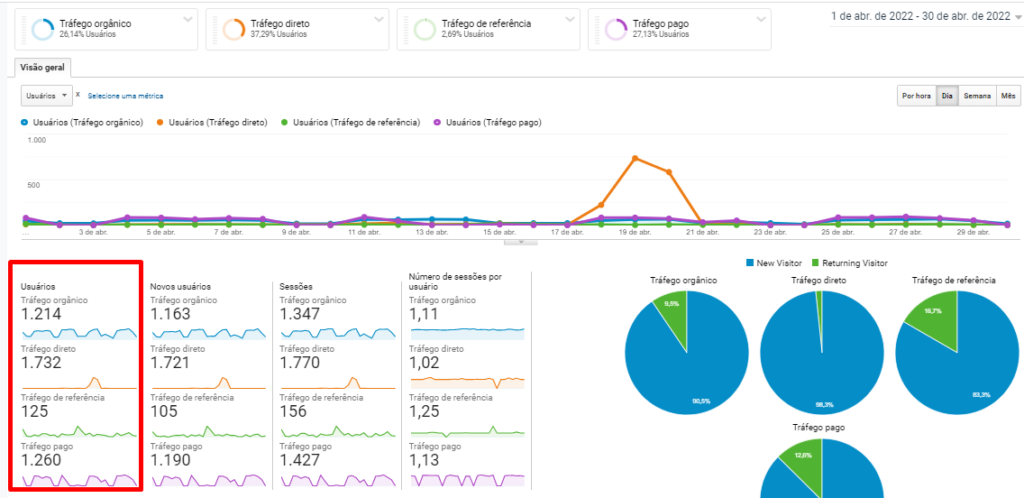 Nesta outra imagem, vemos o tráfego orgânico e pago desde o início do projeto até abril de 2022. Veja os números incríveis atingidos: