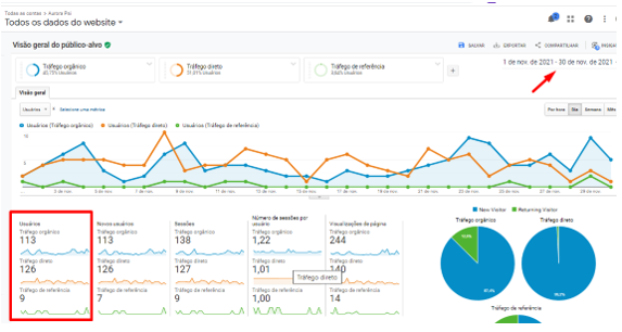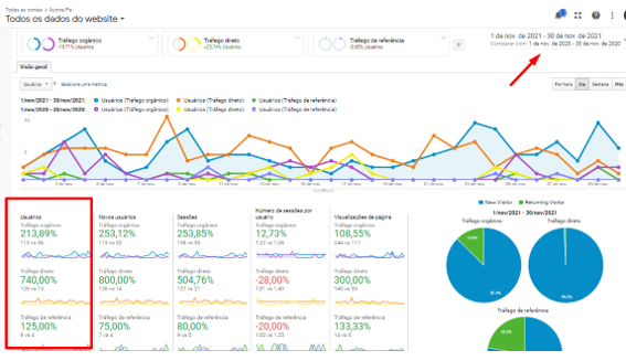 Nessa imagem, podemos destacar o crescimento de 213% no tráfego orgânico em comparação com novembro de 2020.