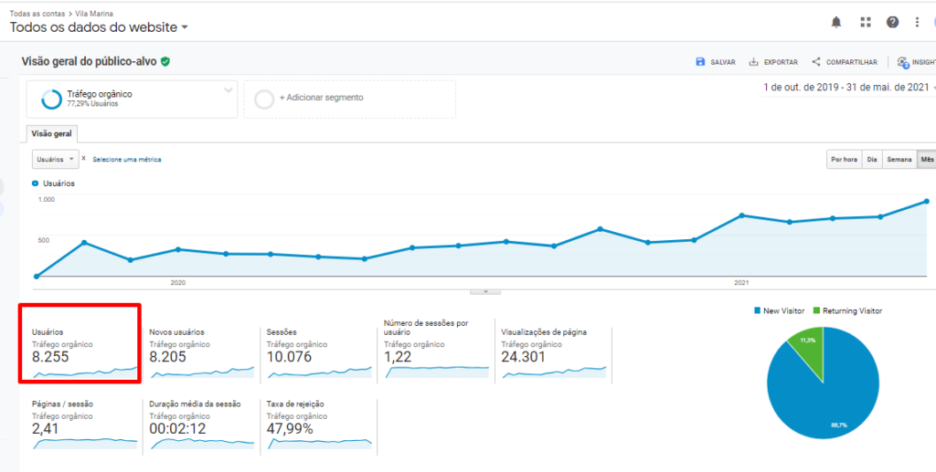 Nesta outra imagem, vemos o tráfego orgânico desde o início do projeto até maio de 2021. Veja os números incríveis atingidos: