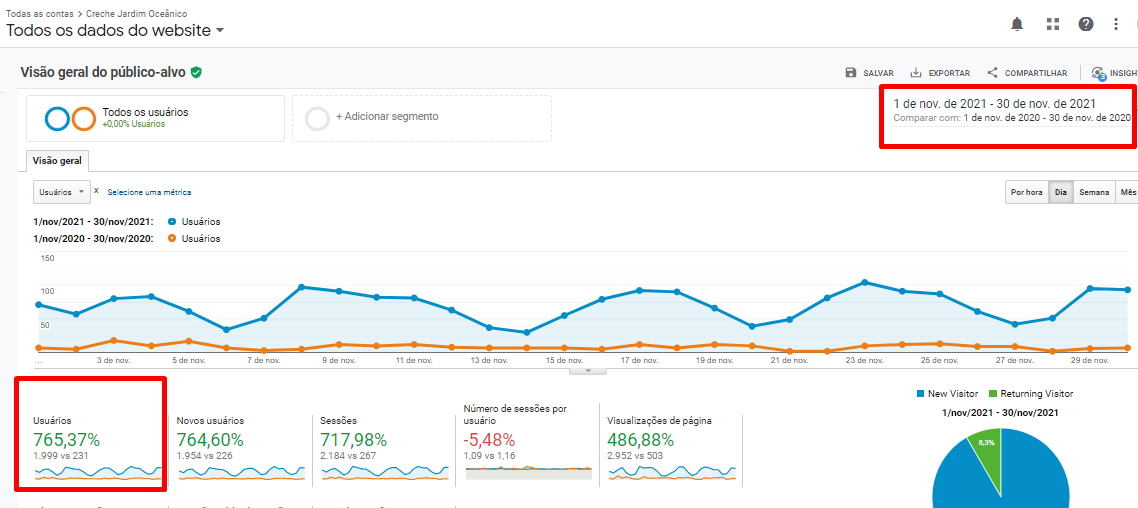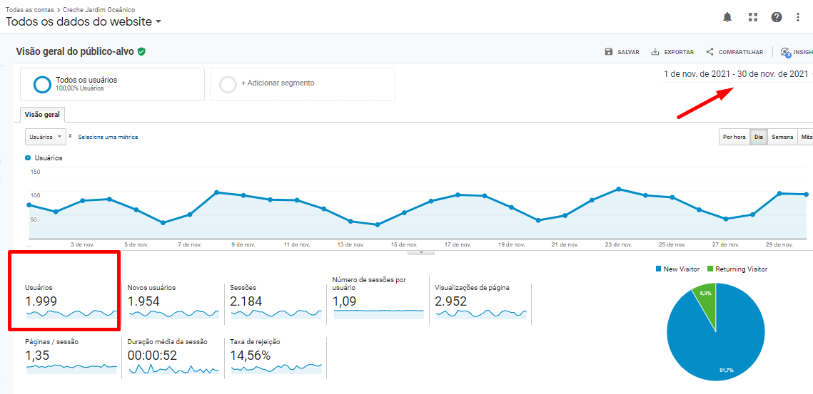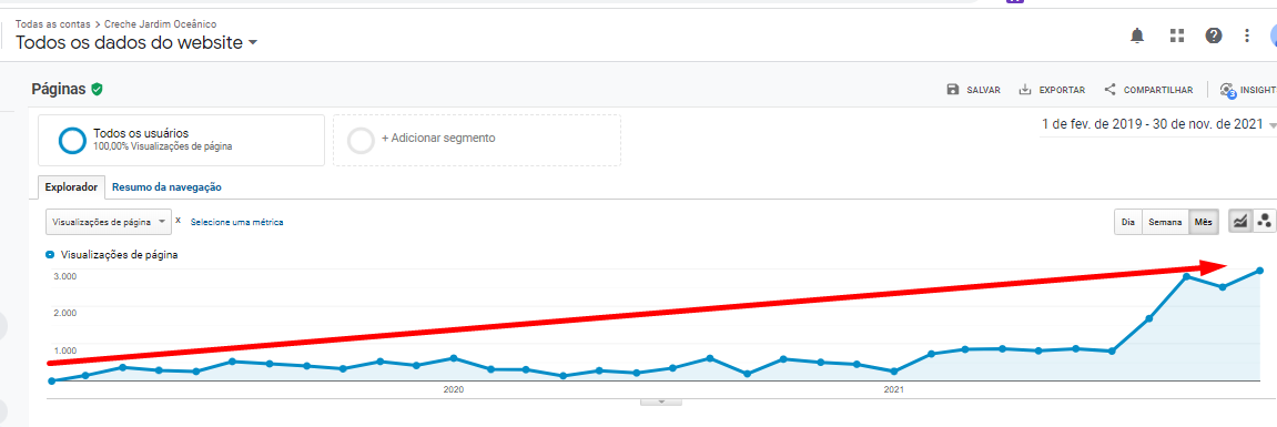 Na imagem acima, é representado o tráfego orgânico do site da creche escola no mês de novembro de 2021. Foram 1.999 acessos orgânicos (no mês), representando um crescimento expressivo desde o início do projeto de SEO.