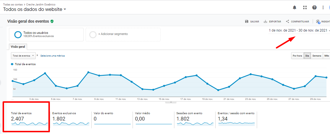 Imagem: Demonstração dos eventos de tráfego orgânico, realizados no mês de novembro de 2021 no site.