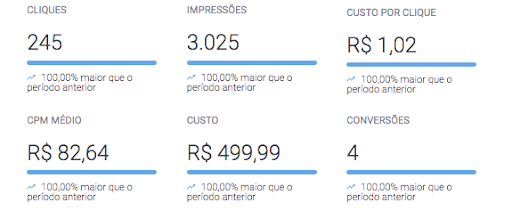 Comparado a investimentos anteriores, os cliques, impressões e conversões cresceram 100%, com o valor por clique abaixo.