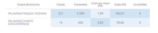 Duas campanhas de pesquisa foram aplicadas, com a primeira voltada para trabalhar o branding da pizzaria e a segunda para captar clientes através da concorrência.