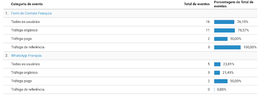 Nesta imagem podemos observar de onde se originou cada evento, de onde os usuários partiram até a entrada no site. Esses cliques de eventos podem ser oriundos das redes sociais, de campanhas pagas e da performance de SEO que é o tráfego orgânico no site, sem necessidade de investimentos a parte para as plataformas.