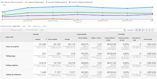 Para medir e monitorar o tráfego dos usuários, usamos o analytics. Com essa ferramenta mensuramos o número de visitantes do site e de onde eles vieram.